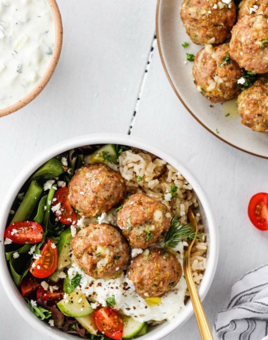 Mediterranean chicken bowl with fresh veggies, Tzatziki, and rice